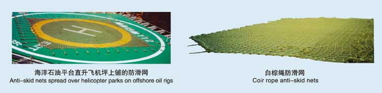 采用白棕繩、尼龍繩、防靜電尼龍繩為原料,編織采用交差穿插的方法,用于海洋石油平臺(tái)直升飛機(jī)坪、船甲板。